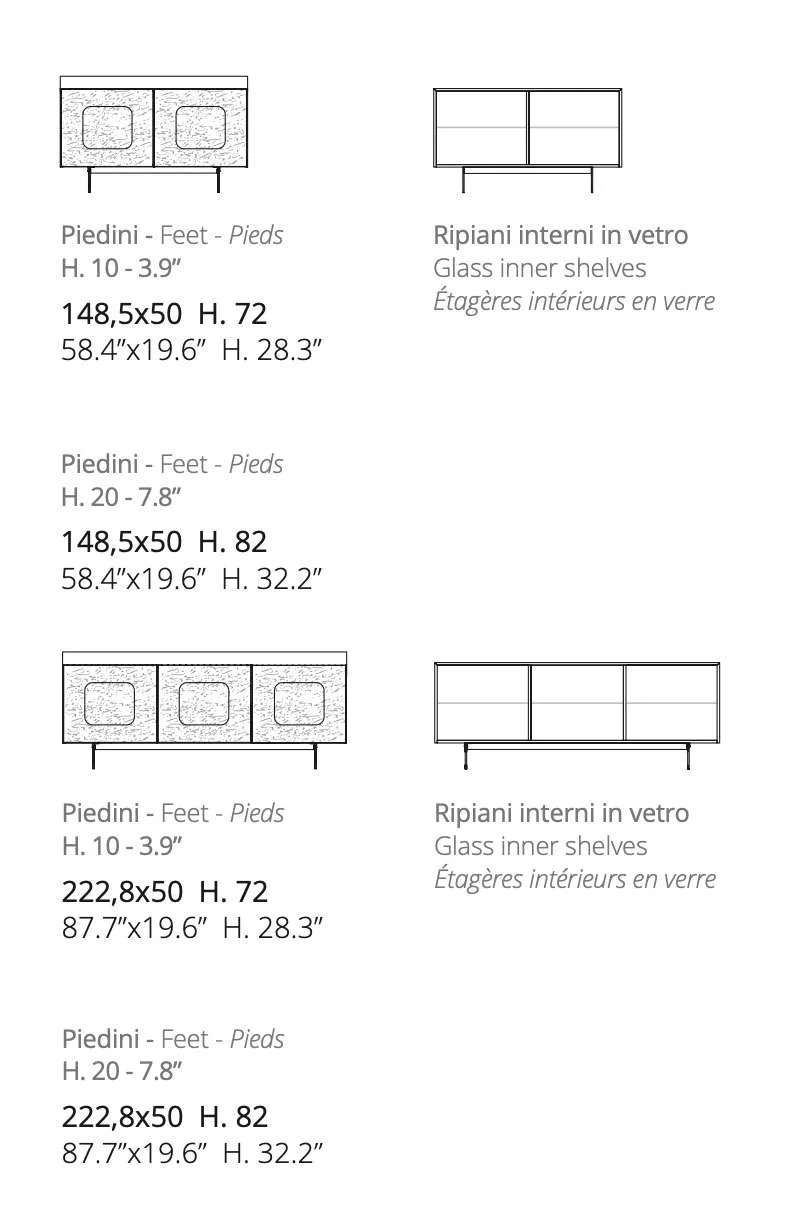 Komoda-indauja su 2 ir 3 durų versijomis, stiklinėmis vidinėmis lentynomis, durelių apdaila iš sidabro matinio stiklo, rėmas iš dažyto aliuminio. Stiklinės arba metalinės kojelės gali būti dviejų aukščių – 10 ir 20 cm.