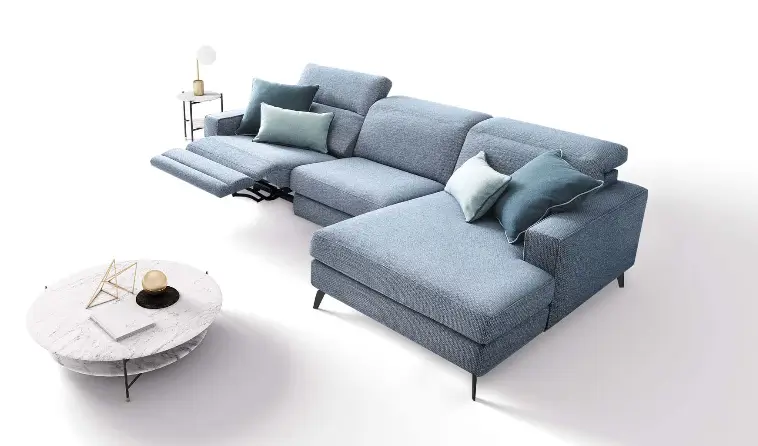 Moderni sofa su reglaineriu, reguliuojamomis galvos atramomis ir paryškintu apvadu.