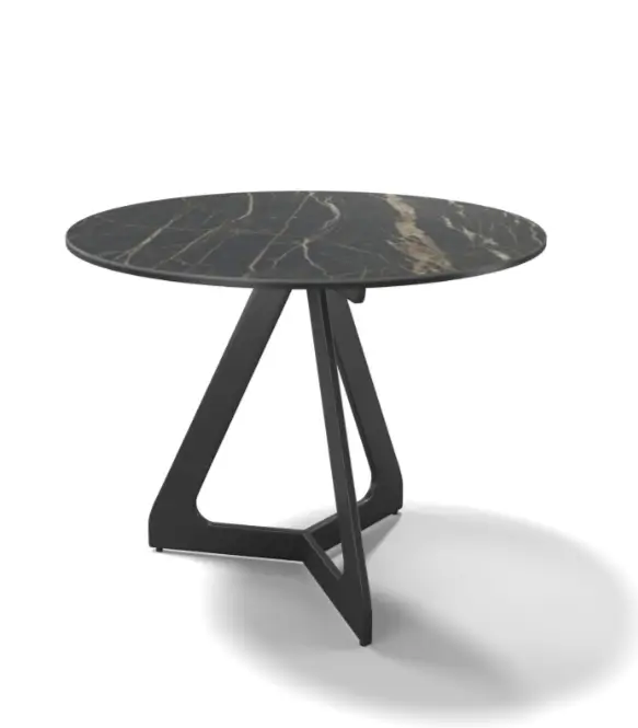 TSURUGI – modernus, apvalus su keramika ant stiklo stalviršiu ir tvirtomis metalinėmis kojelėmis kavos staliukas.